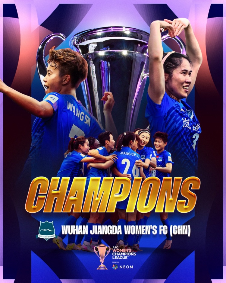 NBA直播5月25日讯 首届女足亚冠联赛决赛,武汉车谷江大女足通过点球大战击败墨尔本城女足,夺得女足亚冠冠军奖杯。 女足亚冠联赛官推晒出了祝贺武汉女足夺冠的海报,并配文写道:“首届女足亚冠联赛冠军—武汉江大女足!”