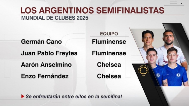 NBA直播7月5日讯 世俱杯1/4决赛结束两场,切尔西和弗鲁米嫩塞会师半决赛。 由于切尔西、弗鲁米嫩塞队中各有2名阿根廷球员,这意味着至少2名阿根廷球员将进入世俱杯决赛。 弗鲁米嫩塞:热尔曼-卡诺、胡安-帕布洛-弗赖特斯 切尔西:安塞尔米诺、恩佐