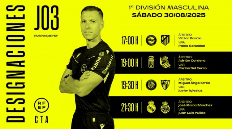 NBA直播8月30日讯 西甲官方公布了当地时间周六进行的4场西甲比赛的裁判安排,其中何塞-马里亚-桑切斯将执法皇马VS马洛卡。 以下为具体裁判安排情况: 阿拉维斯VS马竞 主裁判:维克托-加西亚 VAR裁判:巴勃罗-冈萨雷斯 皇家奥维耶多VS皇家社会 主裁判:阿德里安-科尔德罗 VAR裁判:卡洛斯-德尔塞罗 赫罗纳VS塞维利亚 主裁判:米格尔-安赫尔-奥蒂兹 VAR裁判:哈维尔-伊格莱西亚斯 皇马VS马洛卡 主裁判:何塞-马里亚-桑切斯 VAR裁判:胡安-路易斯-普利多
